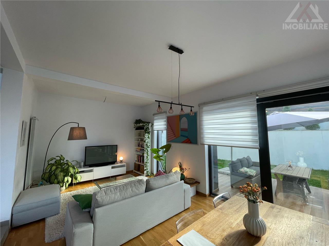 Amenajari exterioare: terasa si trotuare din beton amprentat, doua locuri de parcare, curtea frumos amenajata cu gazon si pomi ornamentali